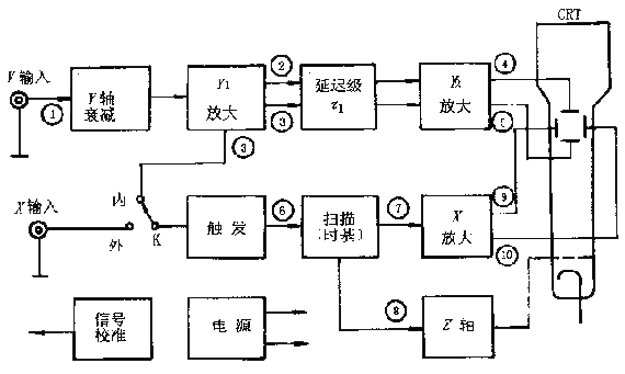 被測(cè)信號(hào)①接到“Y"輸入端經(jīng)Y軸衰減器適當(dāng)衰減后送至Y1放大器(前置放大)推挽輸出信號(hào)②和③。經(jīng)延遲級(jí)延遲Г1時(shí)間到Y(jié)2放大器。放大后產(chǎn)生足夠大的信號(hào)④和⑤加到示波管的Y軸偏轉(zhuǎn)板上。為了在屏幕上顯示出完整的穩(wěn)定波形將Y軸的被測(cè)信號(hào)③引入X軸系統(tǒng)的觸發(fā)電路在引入信號(hào)的正(或者負(fù))極性的某一電平值產(chǎn)生觸發(fā)脈沖⑥啟動(dòng)鋸齒波掃描電路(時(shí)基發(fā)生器)產(chǎn)生掃描電壓⑦。由于從觸發(fā)到啟動(dòng)掃描有一時(shí)間延遲Г2為保證Y軸信號(hào)到達(dá)熒光屏之前X軸開(kāi)始掃描Y軸的延遲時(shí)間Г1應(yīng)稍大于X軸的延遲時(shí)間Г2。掃描電壓⑦經(jīng)X軸放大器放大產(chǎn)生推挽輸出⑨和⑩加到示波管的X軸偏轉(zhuǎn)板上。z軸系統(tǒng)用于放大掃描電壓正程并且變成正向矩形波送到示波管柵極。這使得在掃描正程顯示的波形有某一固定輝度而在掃描回程進(jìn)行抹跡。