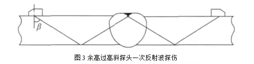 焊縫余高過(guò)高時(shí)會(huì)出現(xiàn)頂部盲區(qū)。采用斜探頭一次波進(jìn)行焊縫單面探傷時(shí)(圖2)克服頂部盲區(qū)的方法是采用小前沿、大K值的探頭。采用斜探頭一次反射波進(jìn)行焊縫單面探傷時(shí)(圖3)克服頂部盲區(qū)的辦法是減小探頭角度。