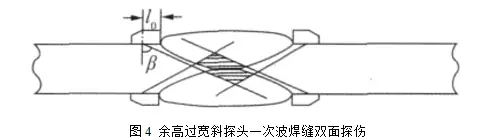焊縫余高過(guò)寬時(shí)會(huì)出現(xiàn)焊縫中部盲區(qū)克服中部盲區(qū)的辦法是增大探頭角度和減小探頭前沿長(zhǎng)度(圖4).