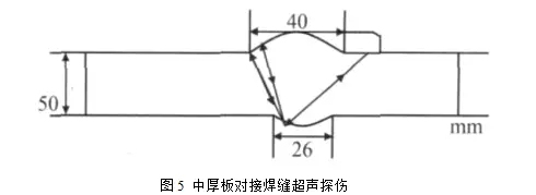 中厚板對(duì)接焊縫超聲波探傷時(shí)探頭下擴(kuò)散聲束在焊縫表面的反射回波很容易被誤判為缺陷。如在厚板焊縫中(T=50mm左右)常發(fā)現(xiàn)距背面4~10mm深度范圍內(nèi)的熔合線附近有不同長(zhǎng)度連續(xù)的超標(biāo)反射波(圖5).